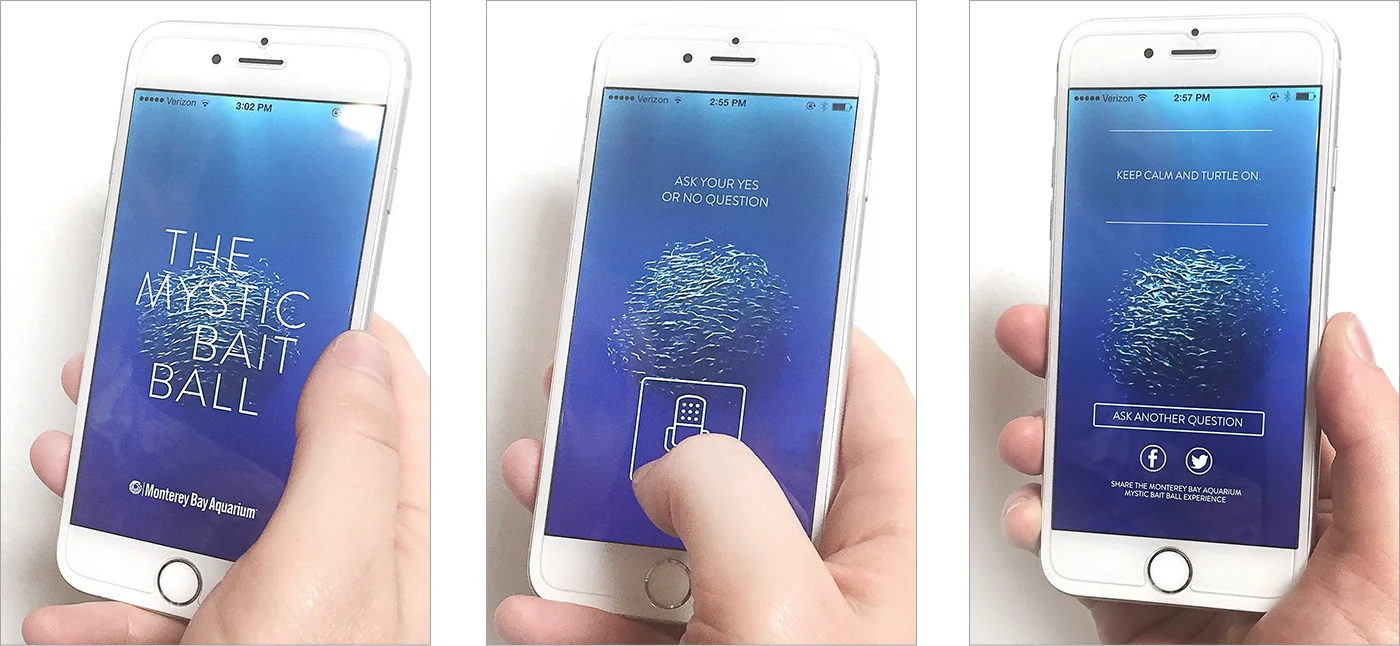 We created the Mystic Bait Ball app—a play on the classic Magic 8 Ball—as part of our Bait Ball Summer experience. It could be downloaded from the Aquarium's site or the iTunes app store. Users were encouraged to share their questions/answers via Facebook and Twitter.